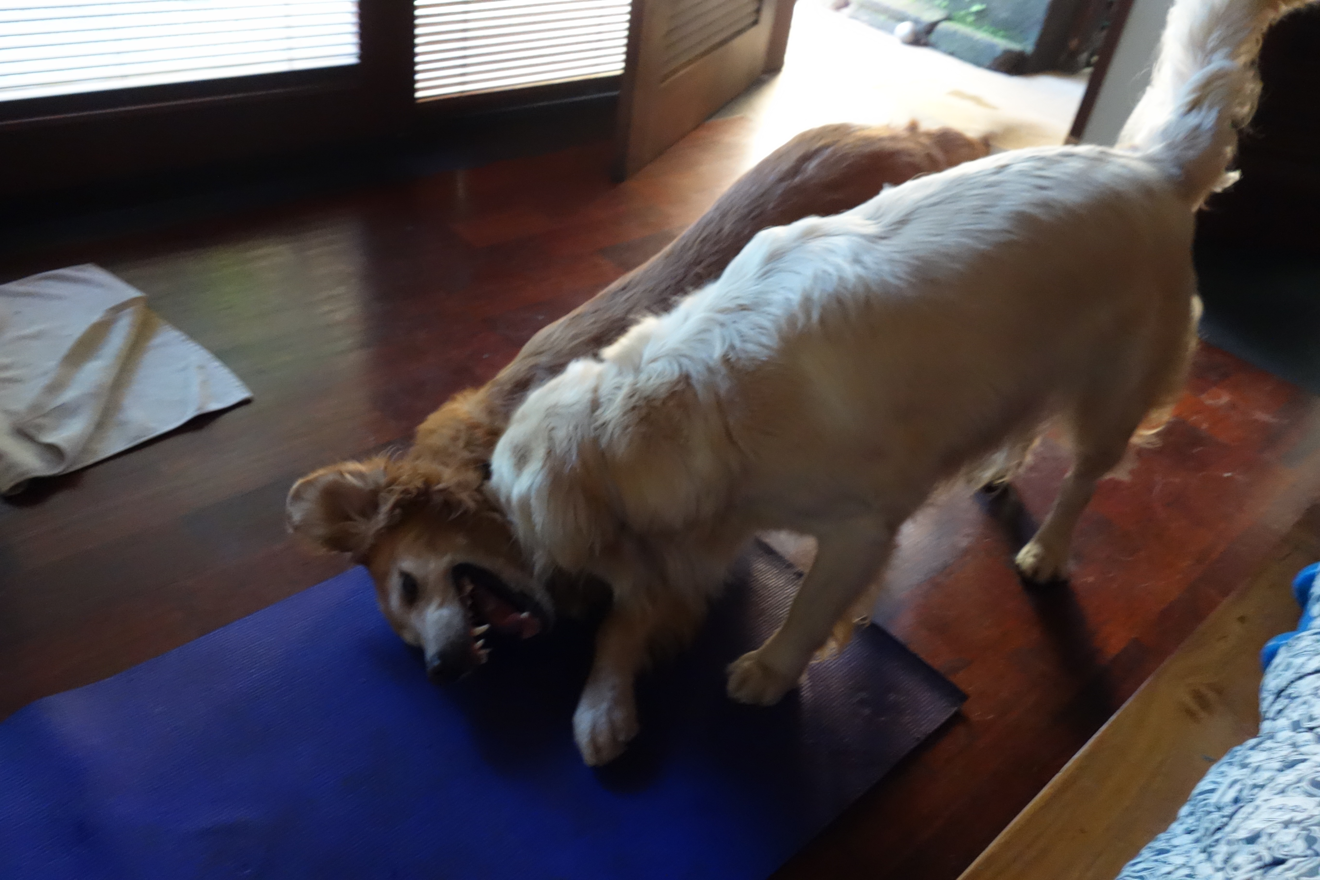 Well, this time they went full-tilt. Both ON and OFF the Mat. Hence this post. They’re starting to get the hang of this floppy item that I unfurl most mornings; except that they seem to be under the impression that it signals play-time. Which means that I have no choice but to wait it out.. OFF the mat. Take a look, then judge for yourself: