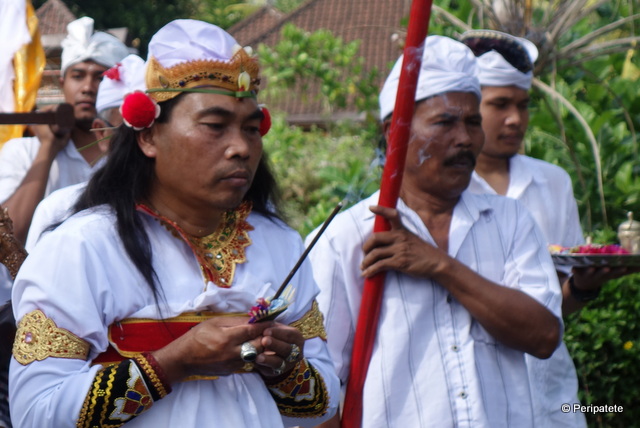 Arm twisting was unnecessary: I rallied a few friends, including one with a car and, with DSC06092traditional garb in bag, we headed out to a remote village in Gianyar (regency) early one day last weekend. It took less than 30 minutes to reach their temple, but we might as well have reached the ends of (Bali’s) earth. Not another foreigner in sight (ok, maybe one, a French girlfriend of a villager).