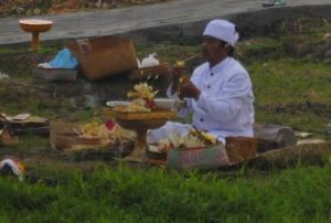 The whole ceremony lasted under one hour. The attending priest – who so happens to be the village priest, my previous landlord… also named Made – was ringing his bell, chanting mantras and blessings and flicking flower petals into the air in front of him.