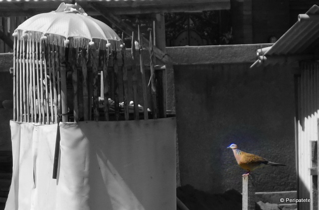 A flock of palm-sized birds flirt and flit from one tree to the other, peeking out from leaves, hopping onto higher branches, then flying away. A pigeon susses out its surroundings to gauge whether it’s safe to nip at the offerings placed on the temporary shrine. It’s quiet enough to hear and see one of their group, perched on one of the penjor’s dried stalks, pecking away at it until it breaks off.
