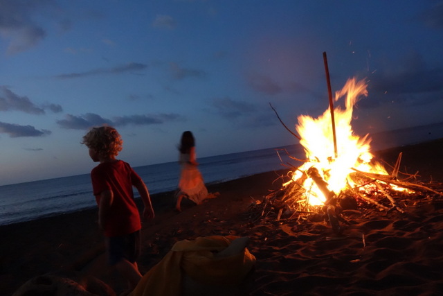 The evening bonfire was as magnificent as any I’ve seen before. Perhaps because it was planned and executed by a professional carpenter. Market-bought, herb-sprinkled, foil-wrapped fish was buried underground while the black sand heated it up to perfection.