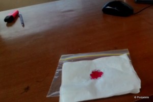 A few questions later, she obliges me and asks me to produce my hand and the cloth. Six pin pricks and bright red droppings on a cloth later, she presses a cotton ball firmly on my finger and sends me off.