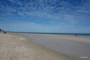 or the better part of the day, I walked along the (spotless!) sandy beach; sunk my feet into the freezing waters, chatted with locals and petted wet ‘n furry dogs that came barreling towards me. A few bold kayakers and one lone sailor braved the slightly choppy waters while crossing the bay, while Virgin and Tiger Air jets glided low towards their landing a short distance away. Seagulls. magpies and a magnificent pelican with outstretched wings soared, dove to water’s edge and lifted wings as if levitating by thermals.