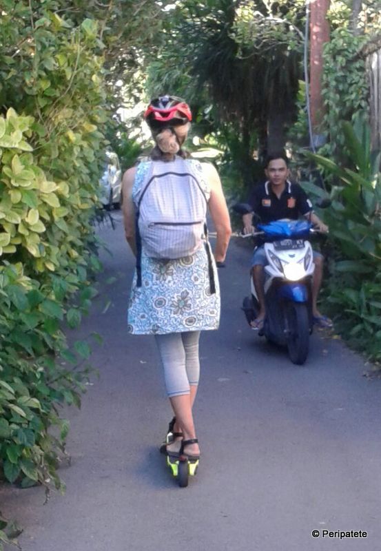 Other questions came up: How and where was I supposed to park the Rat? I tried nudging it onto sidewalks and into shops and cafés; but it was super awkward: the foot-board would pivot on its hinge this way and that (bruising my foot just above the ankle in the process). The charger never fully charged the battery. I had to lean on my front (right) leg all the time, so that my left foot could hover above the back wheel – above which was positioned the brake… resulting in a slightly aching hip. This lean machine was sweet and spunky-looking, but also incredibly clackety: I was shaking like a leaf whenever I tried navigating down many of Sanur’s main or side roads. The beach promenade was out of the question – too much clickety-clack riding over paving stones.