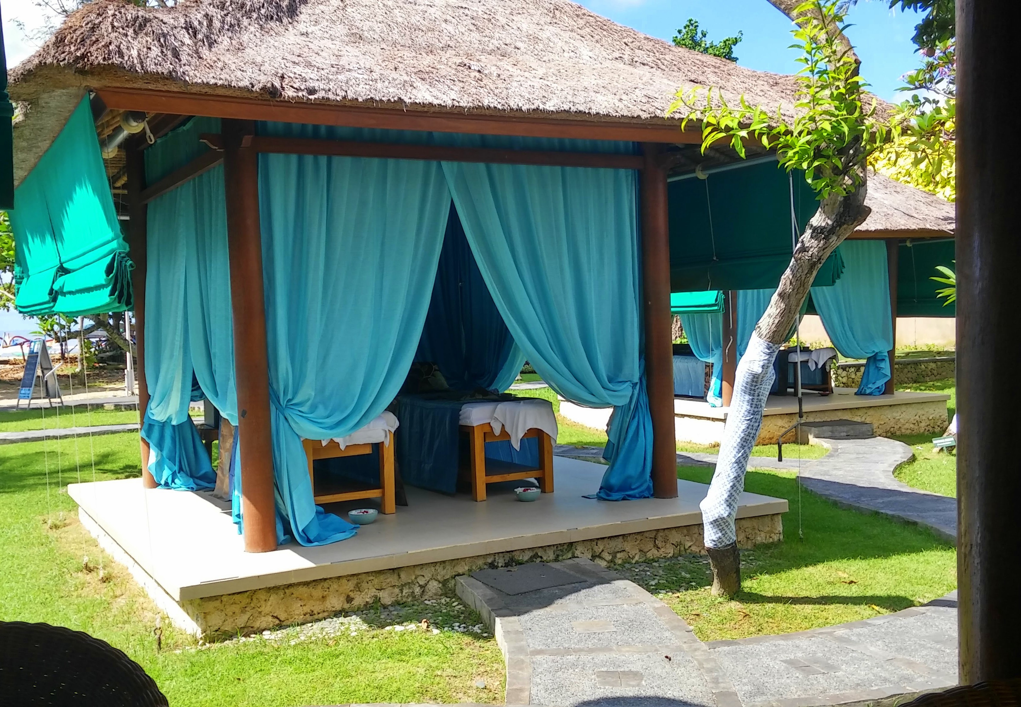 I meandered over to the Aroma Spa, where I walked up to an otherwise open-air but empty reception area. There I met Komang, who offered me white flip flops with pretty little beads glued onto the straps. (“I want to get myself a pretty pair just like these!” I exclaimed to him). Then a sweet Indonesian woman named Wulan appeared, asking me to follow her inside. I walked through a set of doors into a room that featured gorgeous teal-c0lored window curtains draped to the floor. The attention to detail was apparent throughout the airy space; everything was in shades of teal, white and wood.