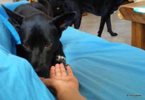 Amigo is papa-bear of the family. He is a huge black chunk of insecurity and laziness, planting and plunking his huge bulk in between another of the dogs and myself; wordlessly insinuating himself into a tete-a-tete. He dare not be excluded from a conversation or love-fest. Amigo is also gifted with the most precious sad-puppy eyes I’ve ever seen. “Give me more love and attention, please,” they beckon. Words aren’t necessary. His message is loud and clear. “Let me in…don’t forget about ME!”