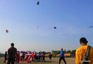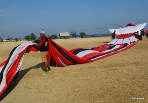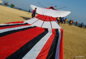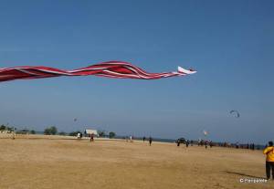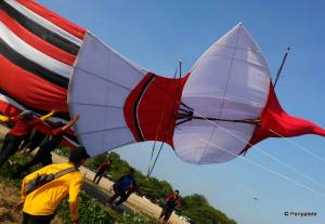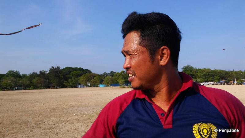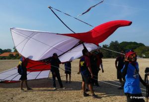 “This kite,” said Wayan, decked out in red polo top (as were a large group of others), “was made by all these men.” He nodded in the direction of the coastline and the further, into waist-high water, where a string of men was holding onto the tail end of the interminably long kite-string.