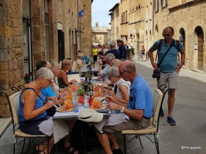 We hoofed it to Colle val d’Elsa – and again, surrounded by wall-mounted crosses and quiet – slept at a convent. Monteriggioni was next – an uphill climb to the tiniest, walled, medieval village we visited; one could see the periphery while standing in its center (perhaps included on the VF for the sole purpose of boosting local tourism).